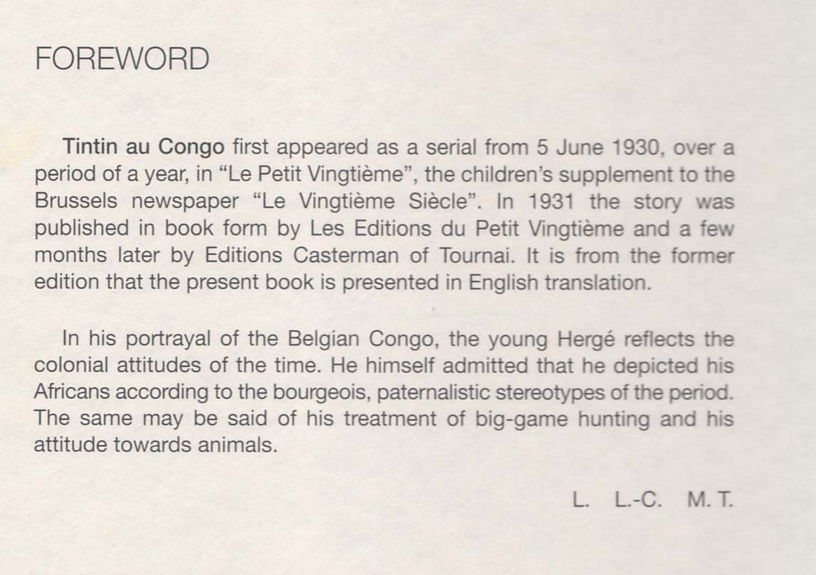 Lo stesso discorso varrebbe per l’albo di Tintin ambientato in Unione Sovietica (il primo della serie, in cui Tintin viene mandato in Russia per “descrivere gli orrori di quel paese”), ma anche per il terzo albo, quello che vede Tintin negli Stati Uniti d’America, anche in quel caso impegnato a illustrare ai giovani lettori le nefandezze stavolta del capitalismo. Il fatto è che quei tre albi, ingenui dal punto di vista del disegno e dei contenuti, zeppi di luoghi comuni e caricature legate al “sentire comune” dell’epoca, furono “commissionati” al giovane Hergé dal suo mentore, l’abate Wallez, con i chiari intenti didattico-pedagogici del cattolicesimo di ultra destra, legato agli ambienti fascisti prima e nazisti poi. Per quanto Hergé la buttasse sul ridere, i contenuti dovuti al “clima generale”, all’indottrinamento, e alle direttive ricevute, non potevano certo non venir fuori. Cosa che, nelle odierne ristampe anastatiche della prima versione, ma anche nelle rielaborazioni successive più “politicamente corrette”, richiederebbe, nel caso si propongano gli albi ai più giovani (e, ormai, non solo a loro, stante una scarsa memoria storica generale), una adeguata prefazione. Quanto al signor Mondondo, la faccenda è tutt’altro che semplice, come raccontava ieri ActuaBD. La sentenza potrebbe arrivare il 5 maggio, ma già si fa notare che gli avvisi (prefazioni) ad hoc realizzati a suo tempo per le versioni in inglese non facevano alcun riferimento a un supposto razzismo, bensì al “colonialismo”.